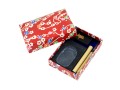 W skład zestawu wchodzi składany pędzelek, czarny tusz w kamieniu oraz naczynie do rozcierania tuszu.
